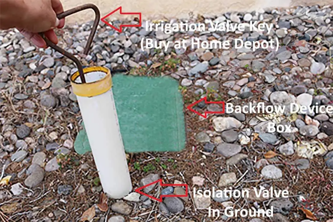 An isolation valve can be a simple valve that can be turned by hand or sometimes it’s a valve deeper in the ground that requires an Irrigation Valve Key to turn it on and off. Those are readily available at Home Depot or most other hardware stores, if you need to get one. If you find an Irrigation Valve Key is needed but don’t have one, you can always turn off the water to the house at the water meter using a Water Meter Key, if you have one. Or sometimes you can use a wrench to turn off the water meter as well. Water Meter Keys are also readily available at Home Depot or other hardware stores. See images below