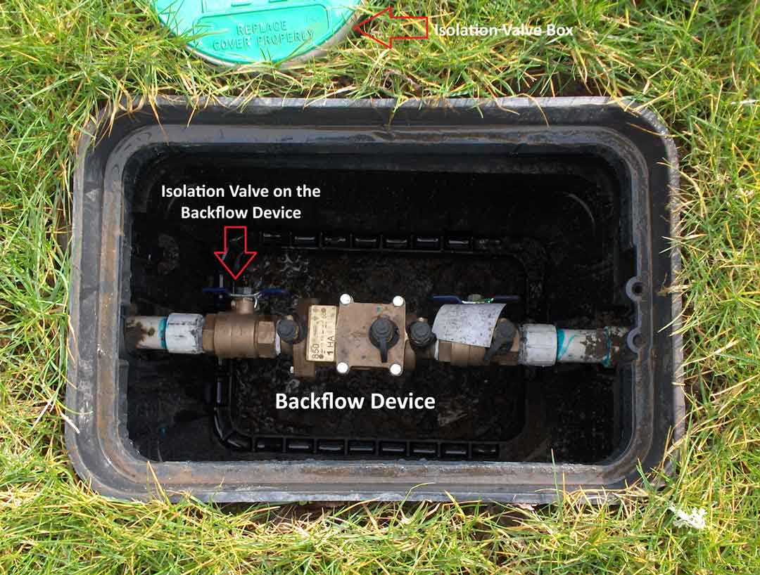Once you locate the valve boxe(s) you can pry them open using a large flat screwdriver. To turn off the isolation valve or the handles (which act as isolation valves as well) on your backflow device, see the video below.